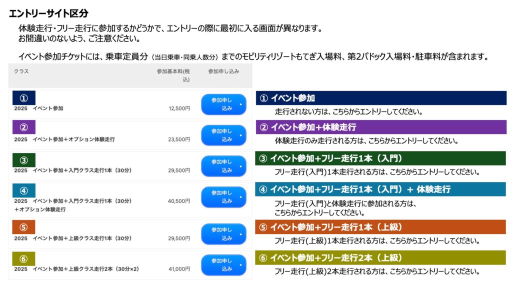 ※3/4(火)20:00開始時点では、イベント参加・イベント参加+体験走行、イベント参加+上級フリー走行1枠、イベント参加+上級フリー走行2枠 いずれも若干数を販売開始いたします。